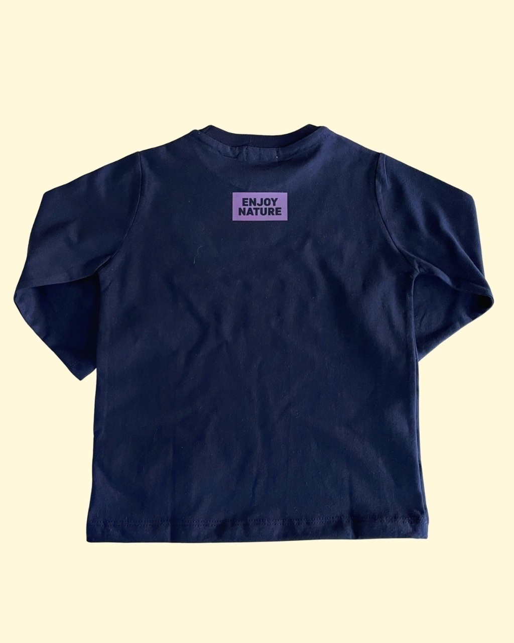 Remera hecha de jersey 100% algodón con cuello de ribb y estampa tanto en frente como en espalda.